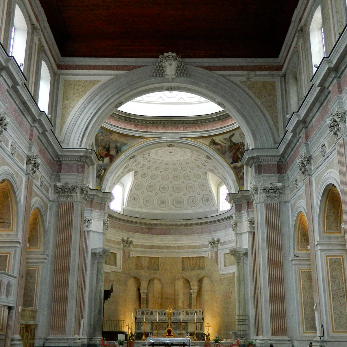 The Basilica of Santa Maria Maggiore at Pietrasanta, located on Via dei Tribunali in Naples, was founded in 533 by Bishop Pomponio on an ancient Roman structure, of which the floors and mosaics remain. According to legend, the Virgin Mary appeared to the bishop and asked him to build the church to counteract the demonic presence of a hellish pig, linking the foundation to the miraculous discovery of a “Holy Stone”. The Romanesque bell tower (10th-11th century), one of the oldest in Naples, preserves reused Roman architectural elements. After the earthquake of 1456, the basilica was rebuilt in the 17th century to a design by Cosimo Fanzago, with a Greek cross plan and a 65-metre dome. Severely damaged during the Second World War, it was closed for decades and even used as a warehouse in the 1970s. It was only reopened for worship in 2007. Today, the complex, with its chapels and underground chambers, represents an important synthesis of the history of Naples.